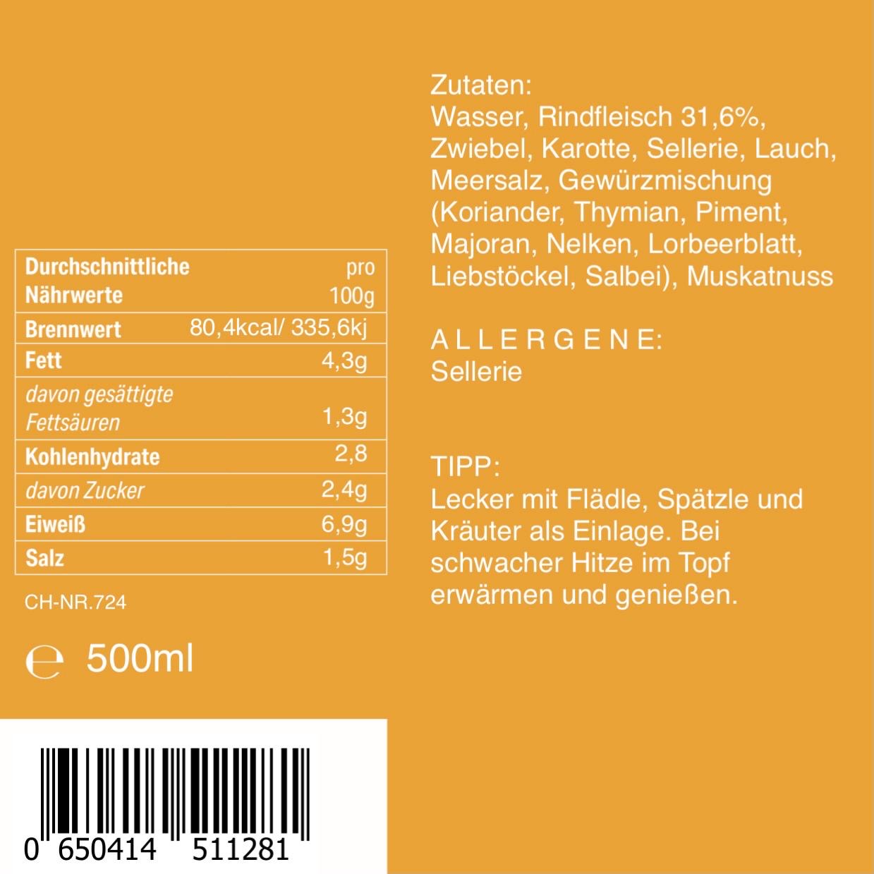 Unsere Rinderbrühe köcheln wir richtig lange, damit wertvolle Nährstoffe wie Kollagen und Aminosäuren aus den Knochen freigesetzt werden. So schmeckt sie besonders kräftig und aromatisch und liefert dabei noch viele wichtige Nährstoffe. Geht als Basis für Eintopf oder mit jeder Einlage, wie zum Beispiel Flädle, Grießklößchen.